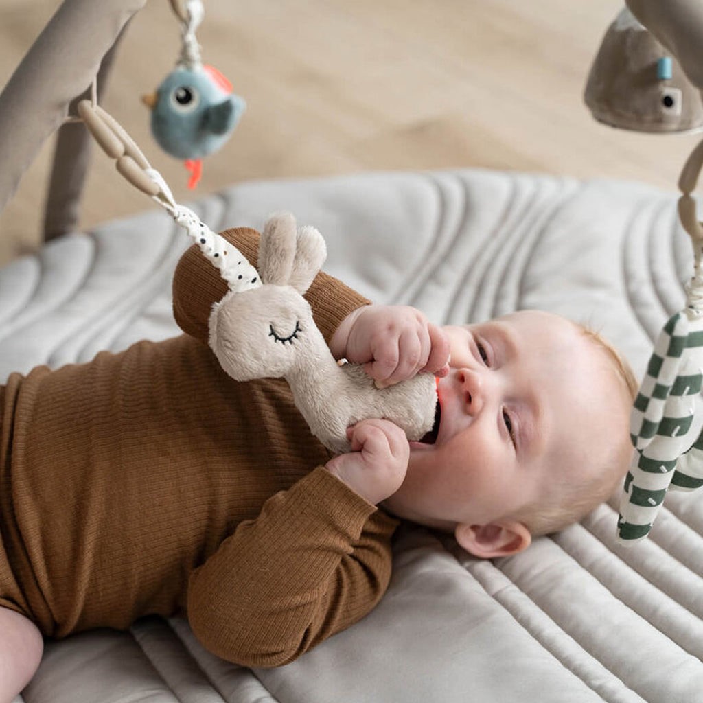 משטח פעילות לתינוק הכי מקסים שראינו מורכב מבסיס קווילט רך וחמש בובות משחק בצבעים שקטים ורכים המתאימים במיוחד לקטנטנים.
